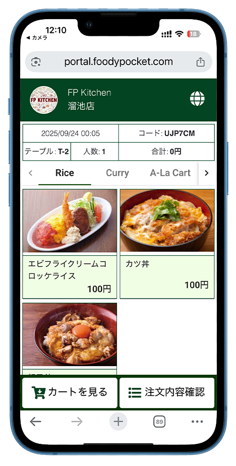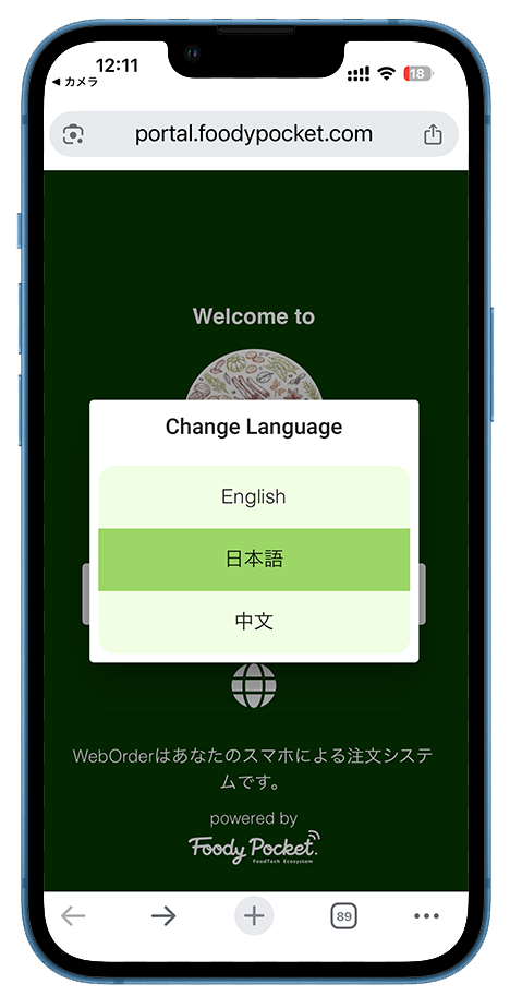 WebOrderはFoody Pocket POSから出力されたワンタイムQRコードをスマホのカメラで読み取れば、そのまま注文メニューが表示されます。アプリのダウンロードなし。